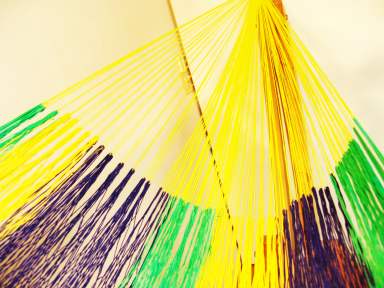 メキシコ、ユカタン半島で1つ1つ手編みされた手作りハンモックです、ベッド部分になる中心はカラフルな綿糸で網目の小さいネットに編まれており(両側の吊り下げ用ラインはナイロン糸)、とても寝心地がよいです。